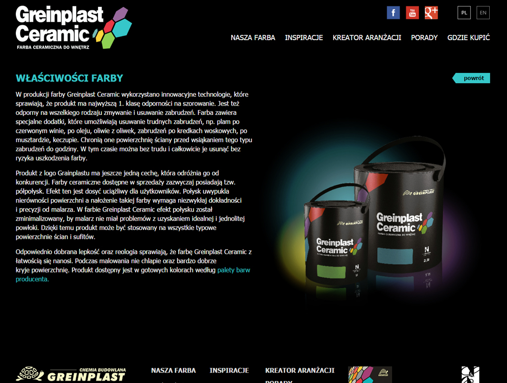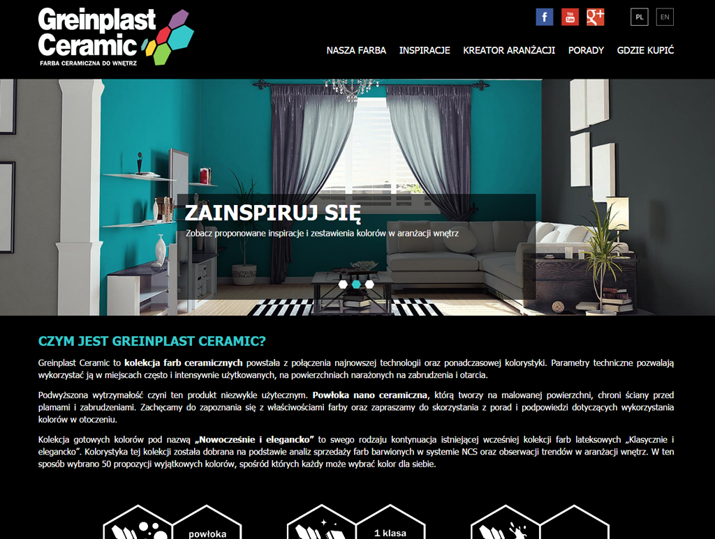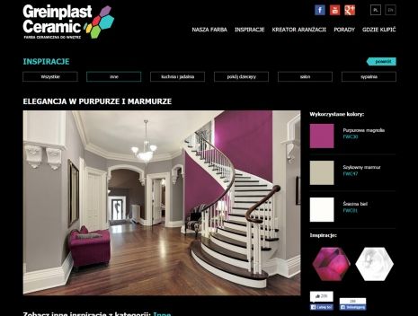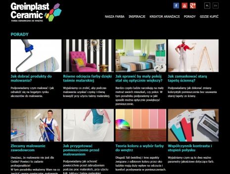 Strona zawiera również poradnik malarski oraz bogaty wybór inspiracji domowych pomieszczeń z wykorzystaniem konkretnych kolorów nowych farb ceramicznych marki Greinplast.