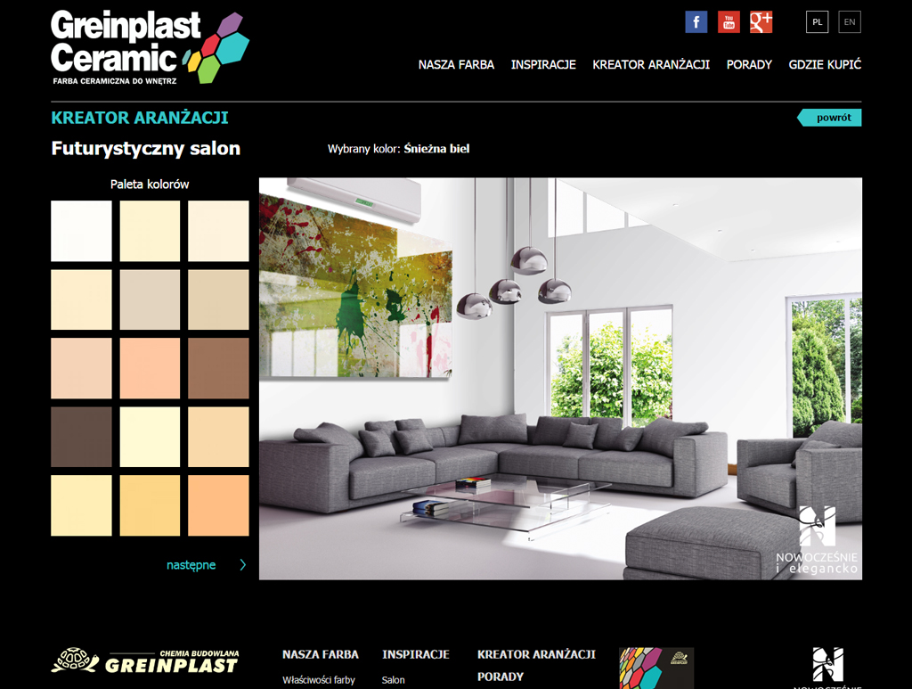 Najważniejszym elementem strony było stworzenie Kreatora Aranżacji. Jest to aplikacja, która umożliwia użytkownikom właściwy dobór zestawienia kolorów nowej farby przy wykorzystaniu dostępnej palety barw oraz przykładowych aranżacji pomieszczeń.