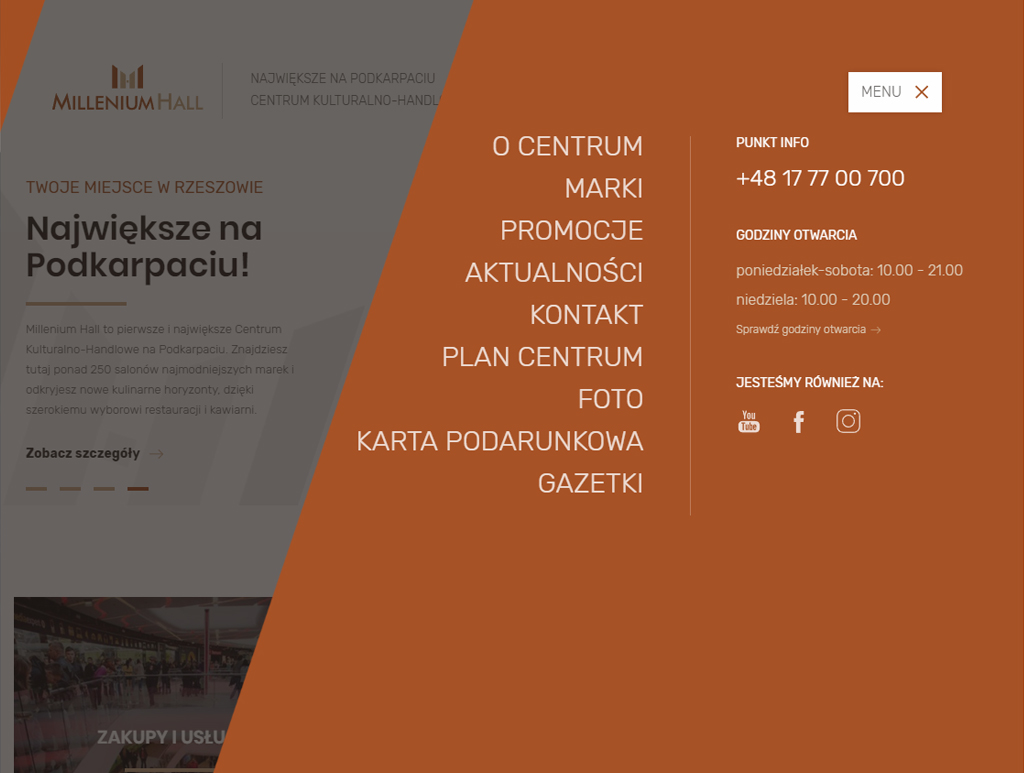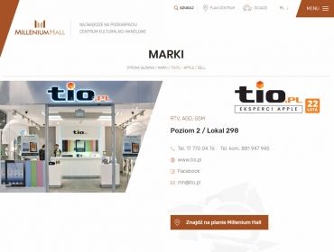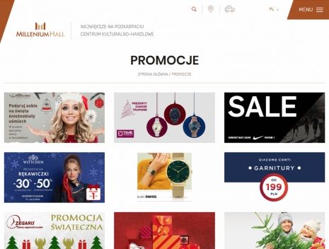 Jasna, przejrzysta, czytelna dla użytkownika strona, zawierająca niezbędne informacje dla klienta Millenium Hall - aktualne promocje, godziny otwarcia, aktualności czy plan centrum.