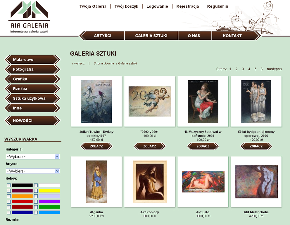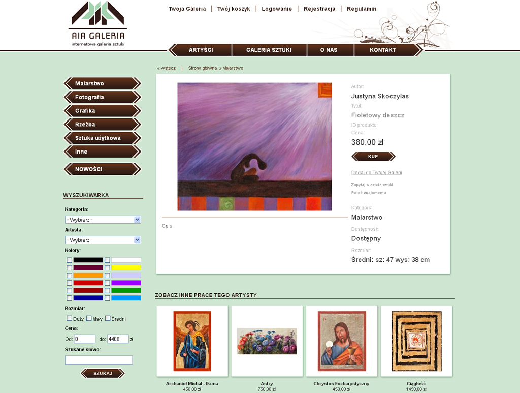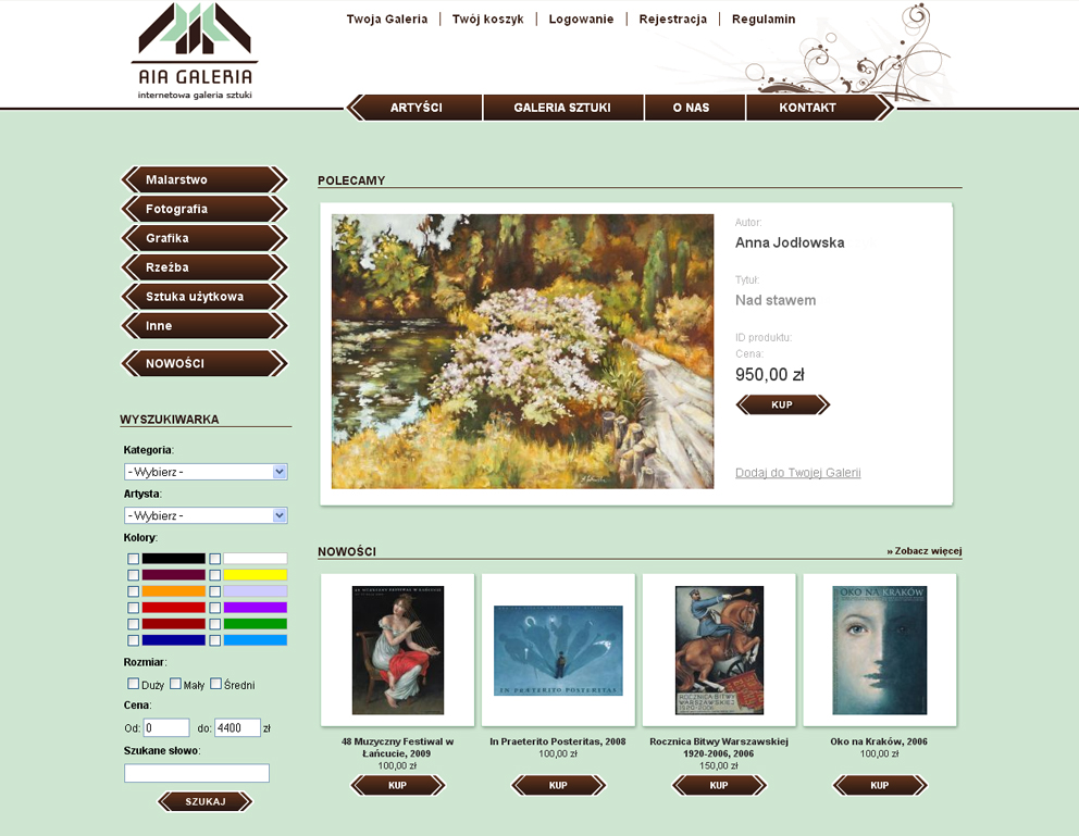 Pierwszy w naszej dotychczasowej działalności sklep internetowy ze sztuką. W ofercie AIA Galeria znajdziecie obrazy, rzeźby, grafiki, fotografię i sztukę użytkową artystów polskich i zagranicznych.