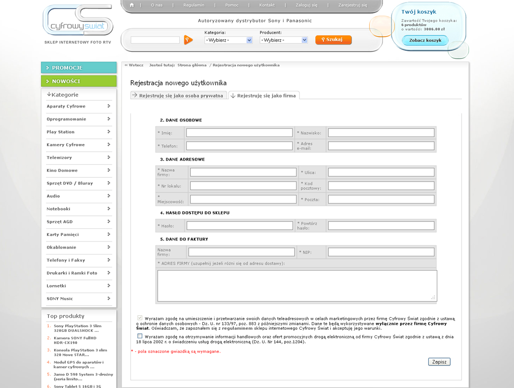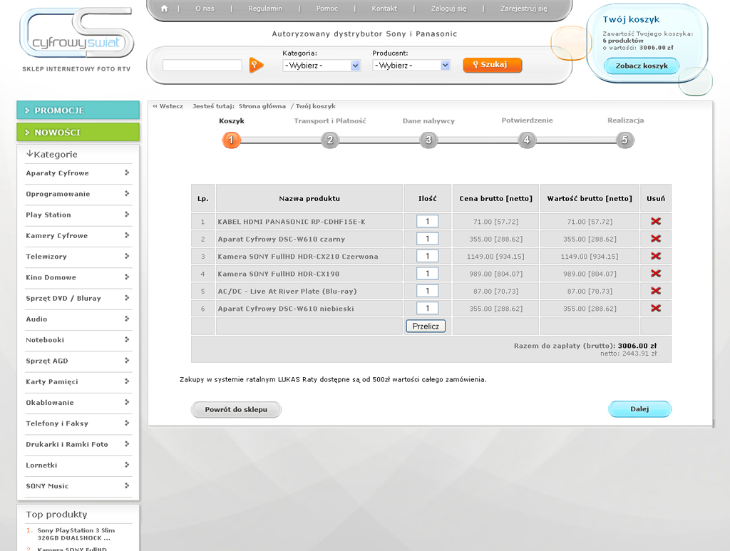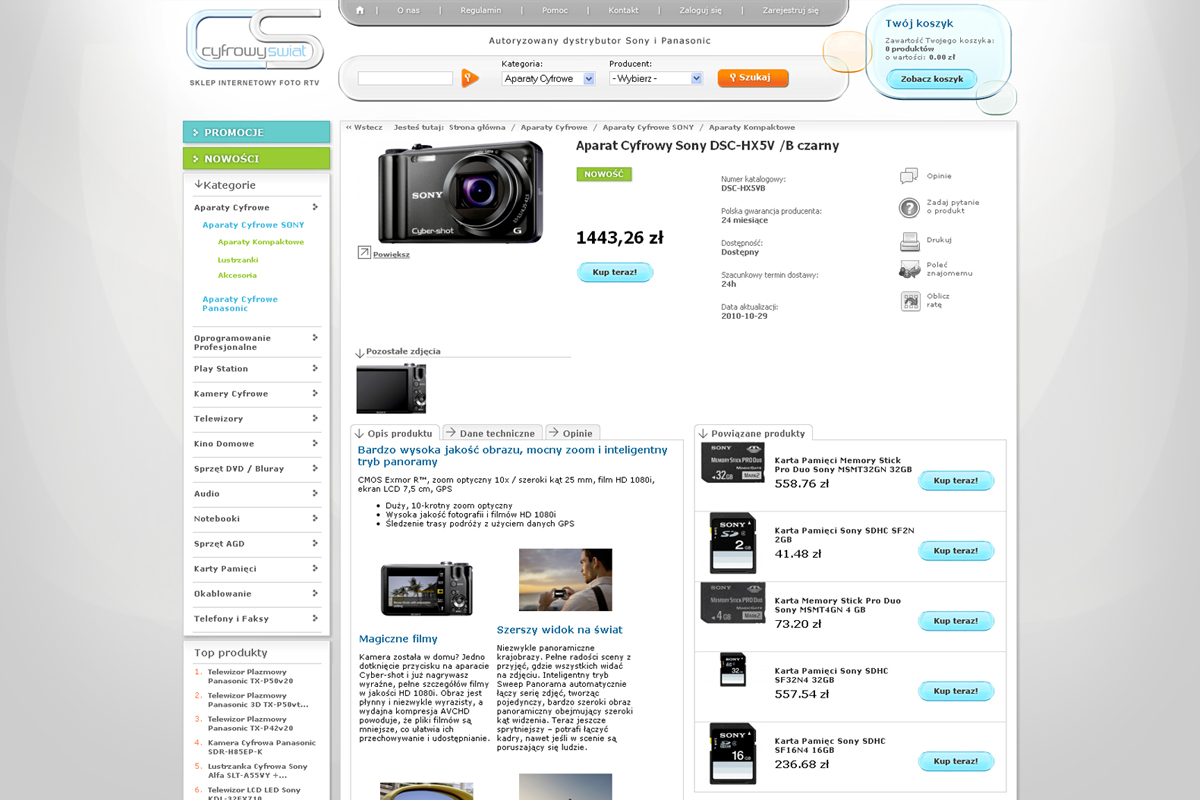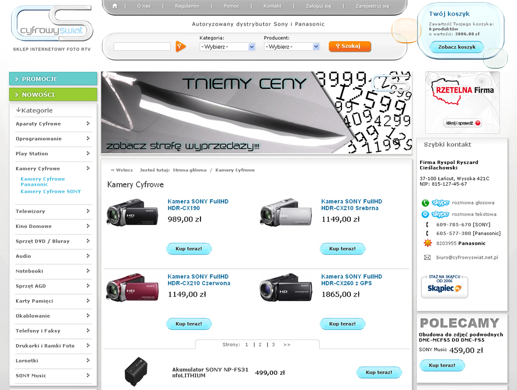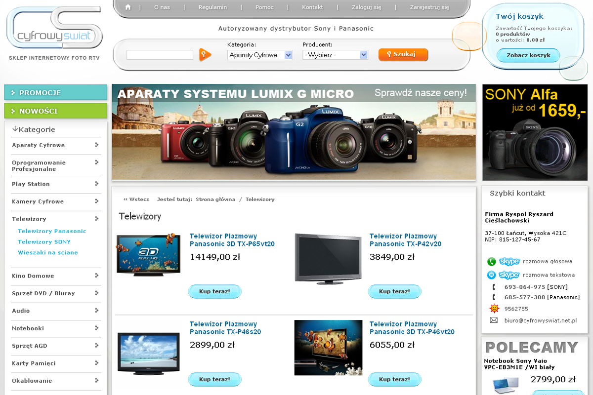 Sklep internetowy Cyfrowy Świat wykonany dla firmy Ryspol, autoryzowanego dystrybutora Sony i Panasonic.
